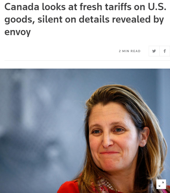 加拿大外交部长克里斯蒂亚-弗里兰(Chrystia Freeland)周二表示,加拿大正在考虑提高对美国征收报复性关税的有效性,但没有回应一位透露渥太华可能采取何种行动的高级官员的言论。