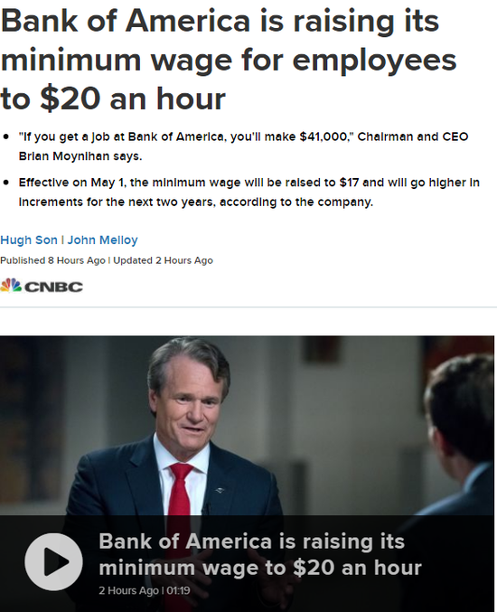 美国银行今年将提高员工的最低工资,并计划在两年内将最低工资提高到每小时20美元。美国银行是美国资产规模第二大的银行,仅次于摩根大通,拥有20.5万名员工。