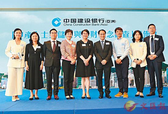 ■建行亚洲昨公布中产人士对储蓄与理财观念调查,左五为郭珮芳,右四为李兆波,右三为三届亚运单车金牌得主黄金宝。