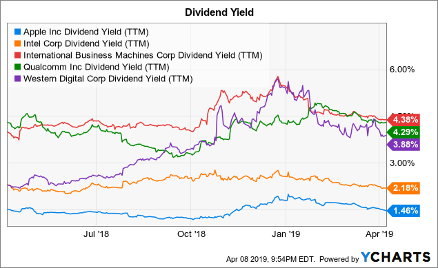 不过,相比英特尔、高通、IBM、西部数据等公司来说,苹果1.46%的股息收益率并不太吸引人,如下图所示。目前公司正在尝试实现货币中性,使净现金流接近于零,不过1300亿美元的头寸与目标相去甚远,4月底财报中公司也可能在分红上下功夫。