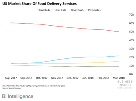 通过下图美国外卖行业市场份额可以看出,很多人都不会想到刚刚进入该领域的Uber市占率可以达到20%。