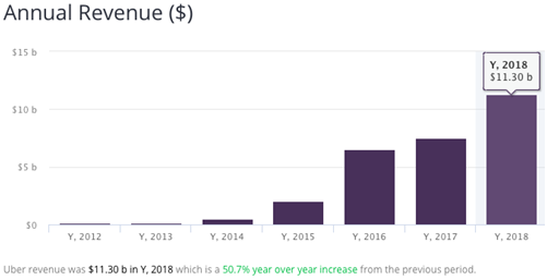 随着网约车市场的不断发展,作为龙头的Uber收入也在快速增长,尤其是从2014-2016年期间,2018年公司营收达到113亿美元,同比增长50.7%。不过,公司虽然在2018年亏损收窄,但其第四季度收入为30亿美元,增速低于第三季度的38%。
