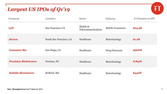 报告还显示,2019年Q1期间美国IPO估值最高的公司就是于4月初上市的Lyft,估值达243亿美元。