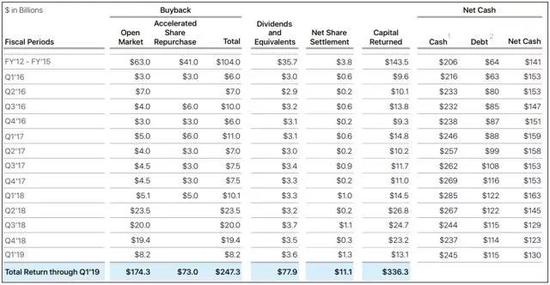 让我们快速回到去年。在第二季度财报中,管理层表示将在第三季度完成2100亿美元的回购计划。因此,董事会正在批准一项新的1000亿美元计划,作为实现现金中立地位的目标的一部分。在下图中,您可以看到Apple在2018年12月季度的资本回报历史。