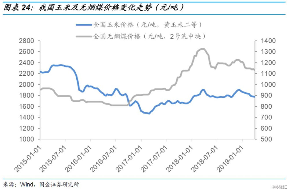 原料、能源价格稳中略降,产品盈利空间丰厚。I+G产品主要以玉米作为主要原料,生产过程中仍需大量耗能,因而原料玉米以及煤炭价格变化将影响产品盈利水平。一方面受到猪瘟影响,玉米作为主要饲料,连同深度加工饲料添加剂产品的需求将有所下滑,预期全年玉米价格不会有较大上行;而煤炭价格受到宏观调控影响,价格暂未有明显变化。整体来看I+G生产成本变化相对较小,稳中略降,而下游产品供不应求,产品价格预期将保持上行,产品盈利空间丰厚。