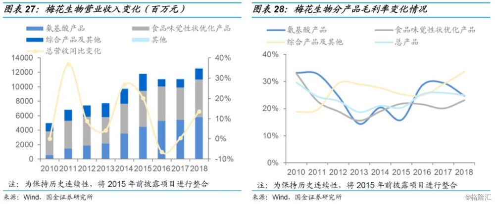 梅花生物基础夯实,发展稳健。公司主要布局氨基酸、调味类产品以及其他综合业务,收益于I+G产品价格提升,抵消了其他产品价格下滑带来的影响,氨基酸业务相对稳定,而公司作为第二大味精供应商,公司受益于行业污染治理带来的供给侧结构优化,目前味精行业库存相对较低,产品价格持续增长,公司味精生产稳定,产品盈利提升将大幅带动公司盈利增长。