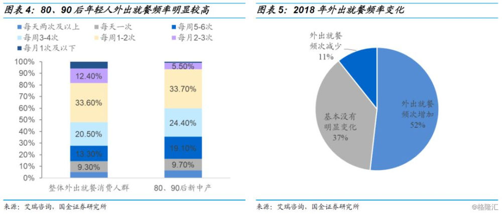年轻一代消费理念变化,“方便”餐饮逐渐发展成趋势。随着时代的发展,社会生产主力群体已经逐步由60、70后向80、90后人群过渡,新一代劳动主力人群在消费理念、消费能力等方面较之前形成较大差异。城镇人口工作时长较长,工作压力偏大,难以有充足的时间和精力在家就餐,方便快捷成为新一代年轻人日常餐饮的关键考虑因素。尤其在一、二线城市,工作及生活区具有较长距离,在外解决午饭以及晚饭是年轻人的主流选择。根据市场调查,80、90后人群外出就餐频率明显提升,而随着劳动主力的年轻化,外出就餐占比将会有持续提升。