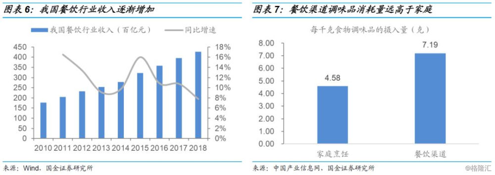国内就餐结构的持续变化将带动国内调味品的市场需求持续提升。近年来我国餐饮行业持续发展,方便、快捷、美味成为行业发展的主要动力。由于外出就餐的味道要求远高于家庭烹饪,因而在餐饮渠道内单位食物的调味品消耗量亦明显增多,餐饮渠道中每千克食物的调味品摄入量较家庭烹饪高出57%。随着我国年轻消费主力群体的转移,外出就餐已经逐渐演化成一种消费习惯,在总体饮食中的占比不断提升。可以预期国内餐饮结构的持续变化将带动国内调味品市场需求的提升。