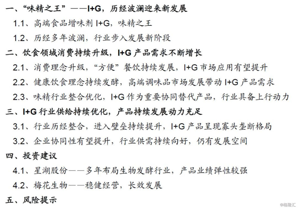 我们认为I+G行业整体呈现供不应求局面,产品价格有上行空间,I+G生产企业有望大幅受益于I+G的产品盈利提升,建议关注星湖科技和梅花生物。