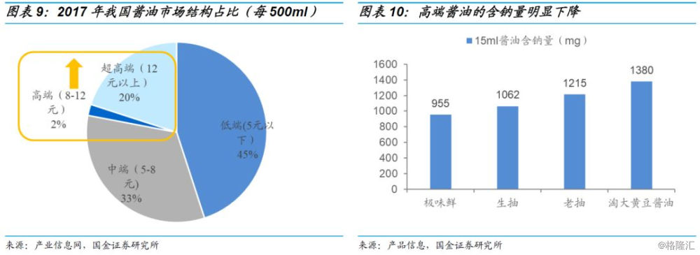 高端产品提升调味效果的同时降低产品含盐量,产品用量将有明显提升。可以看到,我国原本大量使用的黄豆酱油含盐量非常高,每15ml酱油中就含有约3.5g食盐,出于产品调味效果以及健康角度出发,国内高端酱油的复配比例提升,而含盐量却大幅下降。长期以来在烹饪中,调味品的含盐量是限制产品用量的关键,而含盐量的下降将有效促进烹饪过程中对调味料的使用量,在实现产品高端化发展的同时,亦大幅提升产品的市场需求。