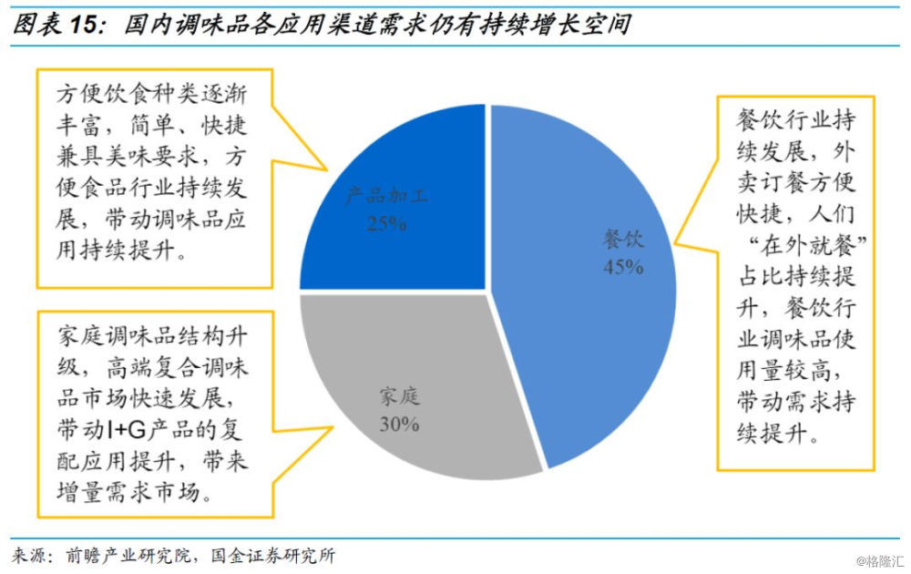 餐饮领域、食品加工发展带动I+G市场需求持续增长,而高端复合调味料的发展带动I+G进入家庭需求市场。伴随着家庭高端调味品消费提升,复合调味品市场获得快速发展,使得I+G逐步走入家庭调味品需求市场,持续为I+G产品带来增量空间;而同时在餐饮行业和产品价格领域,I+G产品需求稳步提升,市场空间不断增长。