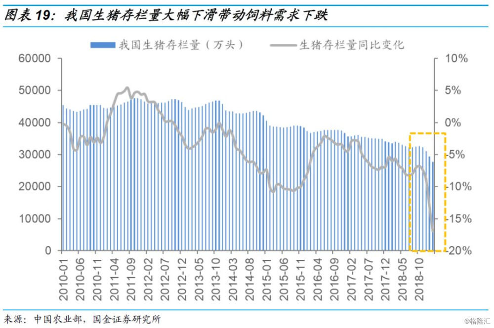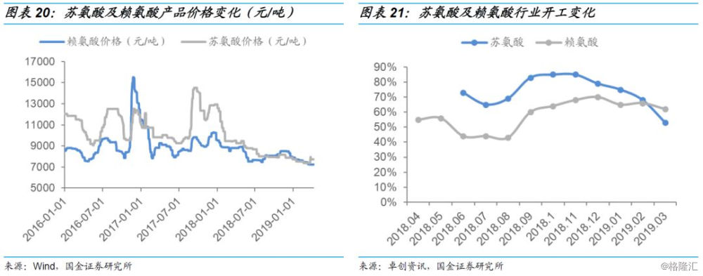 苏氨酸及赖氨酸是生物必须氨基酸,在医药、化学试剂、食品强化剂、饲料添加剂等方面获得了大范围的应用,但其下游的需求大量集中于饲料添加剂领域。此次受到猪瘟疫情影响,我国猪存栏量大幅下降,猪饲料的需求持续下滑,而禽饲料的需求相对稳定,氨基酸的下游饲料产品需求大幅下降,氨基酸产品的价格下行压力较强,市场需求量较少,国内企业承受了较大的盈利压力。