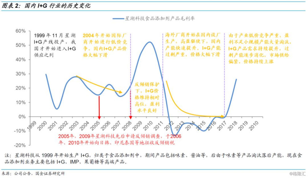 第二阶段:反倾销保护,企业暂得喘息。海外龙头企业由于成本、污染等问题,将生产逐步向东南亚地区转移,2005年、2009年,星湖科技先后申请反倾销调查,对日韩、印尼泰国的I+G产品征收反倾销税。在反倾销税的保护下,国内企业获得了短暂的发展机会,产品价大幅回升。