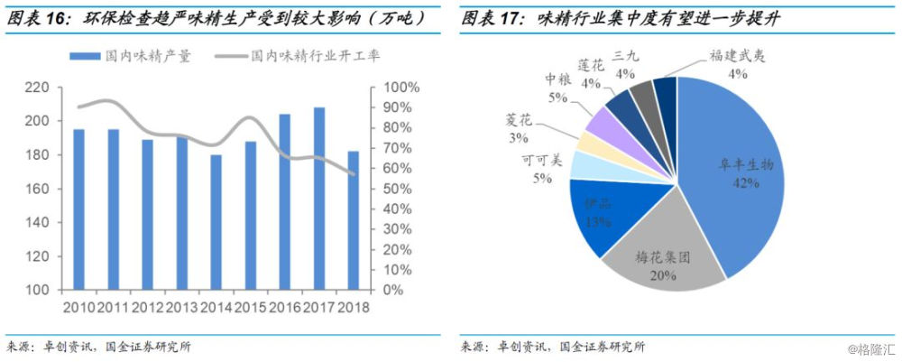 行业无效产能占比提升,环保重压下行业供给格局有望持续优化。多年来,味精行业产能持续提升,行业规模不断增长,然而近10年来,伴随着国内味精产能的增长,行业开工率却在持续下滑,无效产能占比明显提升。2017年以来,国家大幅提升环保治理要求,行业内众多小规模企业既无规模优势,也无环保能力,预期将在未来环境治理中逐步退出市场,味精行业的供给格局有望获得持续优化。