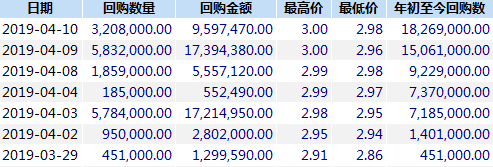公司于2019年4月10日,公司按每股2.98-3.00港元,耗资959.75万港元回购320.8万股,占现有已发行股本0.2172%。自3月29日以来,科通芯城共进行了7次回购操作,累计回购金额5441.81万港元。