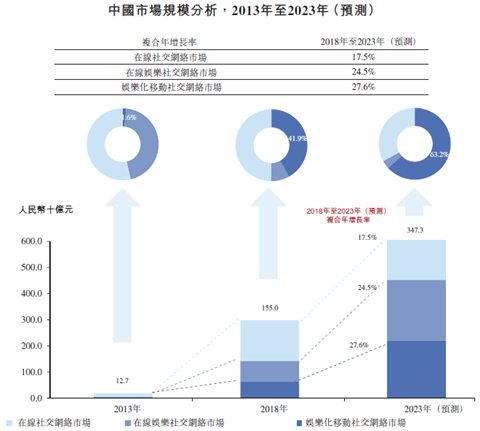 随着我国互联网社交需求的日益增长,我国在线社交网络规模预计到2023年增长到3473亿元,作为市场重要组成部分,在线娱乐社交网络所占比例从2013年的44.9%提升到2018年的50.2%,预计到2023年上升到67%。