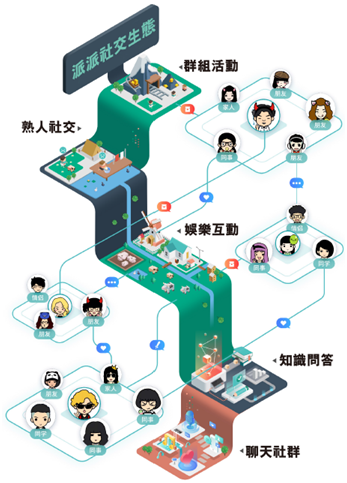 派派以聊天群组、聊天室等社群为社交核心,通过知识问答、群组互动等创新性集体娱乐活动,让用户可充分利用碎片化时间激活并扩大自己的社交圈。此外,农场、整蛊好友等娱乐化功能和服务的加入,使用户间的社交互动更有趣。