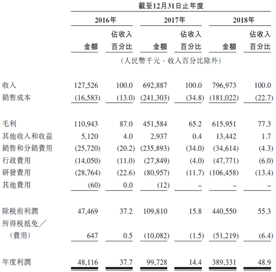 单日启动频率、用户付费率、单日使用时长的增长为公司带来了收入和利润的增加,2016-2018年公司营收分别为1.28亿元、6.93亿元和7.97亿元,年度利润分别达到4811.6万元、9971.8万元和3.89亿元,而且2018年的净利是2017年的3.9倍,毛利率由2017年的65.2%升至2018年的77.3%。