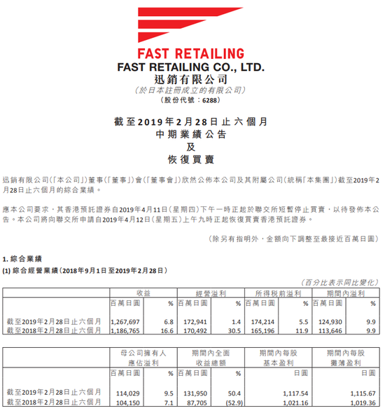 为反映2019年上半财年业绩,迅销将微调截至今年8月底止全财年综合业绩预测,经营溢利由年度初公布的预估值向下修正100亿日元,或3.7%,至2600亿日元,相当于按年升10.1%;但预计全年度包括综合收益及母公司拥有人应占溢利等预估值仍将连续第三年度创新高。另预期全财年派息480日元,同比增派40日元。