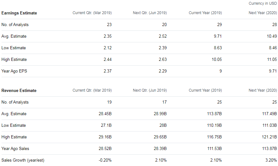 根据雅虎财经数据,分析师预计2019年Q1公司EPS为2.35美元,同比下降0.02美元,而收入预计为284.5亿美元,同比下滑0.2%。四月份有28位分析师覆盖小摩,其中13位将之列入推荐评级,13为列入持有评级,平均目标价为115.48美元。