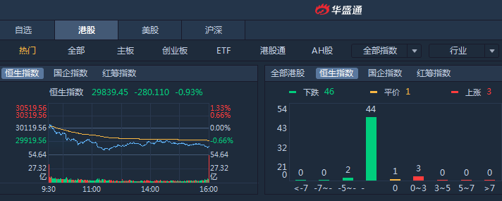 昨日恒指收跌0.93%失守三万关口,航空股、钢铁股集体调整。收盘恒生指数跌280.11点或0.93%,报29839.45点,全日成交额达1197.76亿。国企指数跌1.24%,报11618.04点,红筹指数跌1.56%,报4671.01点。沪港通南向资金流入22.91亿元,深港通南向资金流入4.15亿元。