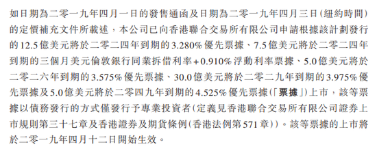 该票据分别为12.5亿美元将于2024年4月11日到期的3.280%优先票据、7.5亿美元将于2024年4月11日到期的浮动利率票据、5.0亿美元将于2026年4月11日到期的3.575%优先票据、30.0亿美元将于2029年4月11日到期的3.975%优先票据、及5.0亿美元将于2049年4月11日到期的4.525%优先票据。