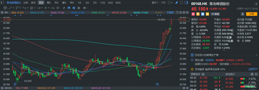 格隆汇4月12日丨早盘青岛啤酒AH股齐升,A股一度升近6%,H股升近7%,创逾九个月新高,现涨5.74%,报45.15港元,暂成交3634万港元,最新总市值607.94亿港元。