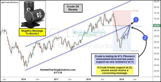 如果油价无法攻克上升阻力位,很可能将转而向下跌破图中②处的支撑位,Kimble认为这一可能性很高,而一旦如此,也将向股市发出警讯。