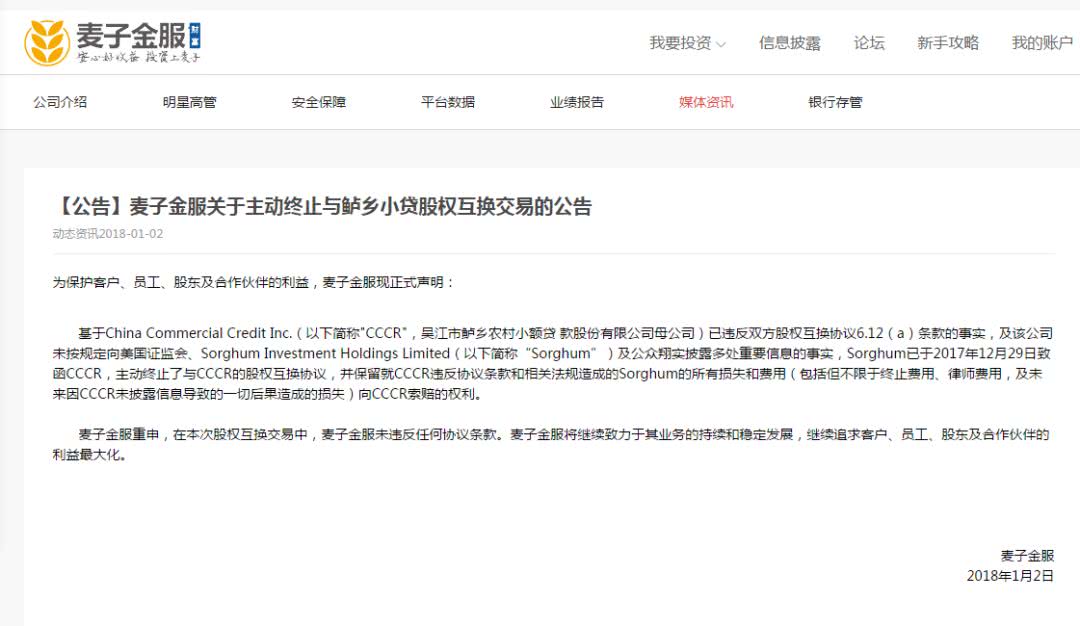 同年12月27日,鲈乡小贷发布公告称,麦子金服违反规定部分条款,包括“未尽力及完全配合交易各方完成协议”、“未及时保持与证券监管机构沟通”等。而麦子金服方面则表示,其未违反换股协议中的条款。