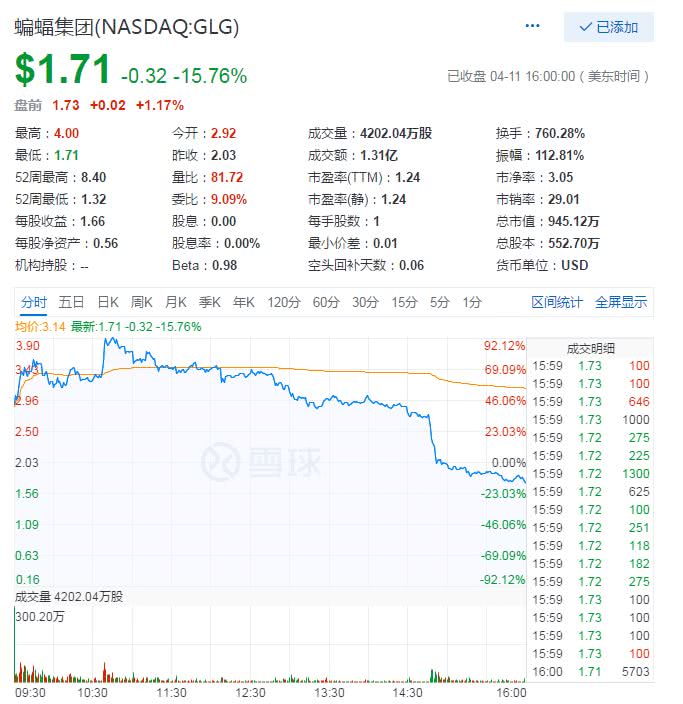 截至2019年4月11日收盘,已经更名为蝙蝠集团的鲈乡小贷,股价已跌至1.71美元。其中,4月11日,鲈乡小贷盘中一度涨超92%,收盘跌幅达到15.76%,总市值为945.12万美元。
