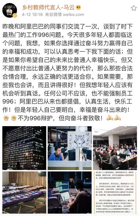 新浪美股 北京时间12日晚间消息 马云周五晚间在微博分享了对近来热门话题996的看法。马云表示,任何公司不应该,也不能强制员工996。他表示,阿里巴巴从来也都提倡,认真生活,快乐工作,但是年轻人自己要明白,幸福是奋斗出来的!不为996辩护,但向奋斗者致敬!