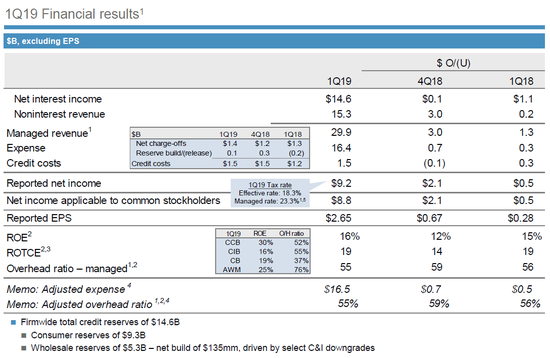 展望未来,摩根大通预计今年的净利息收入将超过580亿美元;2019年调整后的支出将低于660亿美元,冲销支出将不到55亿美元。