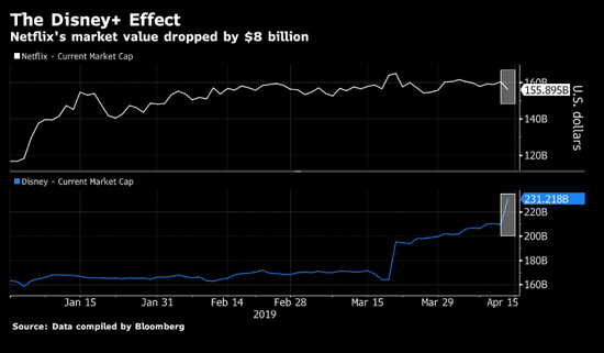 相对于Netflix市值蒸发,迪斯尼则走了相反的路。该公司股价跃升至创纪录高点,市值增加了250亿美元,总市值约为2350亿美元。