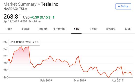 与大盘走向相反的特斯拉股价,今年截止目前已下跌超13%。周五,截止美东时间下午2点48分,特斯拉股价上涨0.15%,暂报268.81美元。