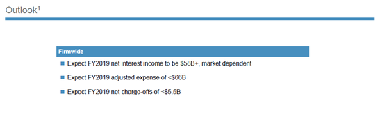 展望未来,摩根大通预计今年的净利息收入将超过580亿美元;2019年调整后的支出将低于660亿美元,冲销支出将不到55亿美元。