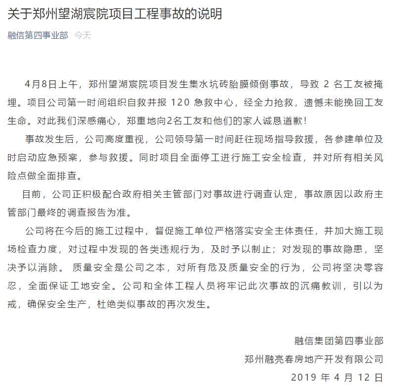 融信集团品牌部回应时间财经称,目前郑州市中原区房管局正在介入调查,项目的区域主管部门以及集团都在积极配合调查,具体原因还需等官方出具报告。目前,公司已对伤亡家属进行安抚,家属情绪稳定。在事故发生之后,集团公司已紧急召开集团工程系统全员视频会议,要求对所有项目进行全面检查。