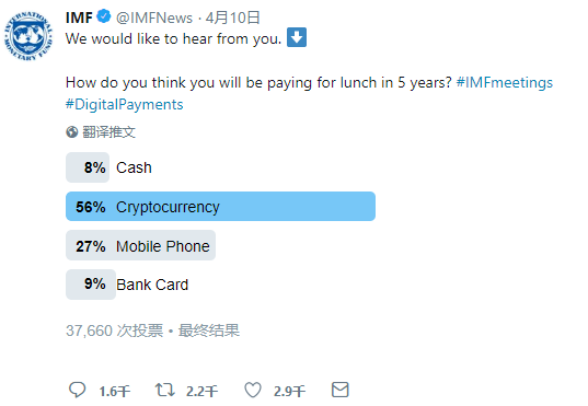 有趣的是,4月10日IMF在推特上发布了一项调查,向网友提问“你认为未来五年间你会用什么支付午餐”。在近四万次投票中,有56%都投给了加密货币,超过了手机、银行卡和现金。