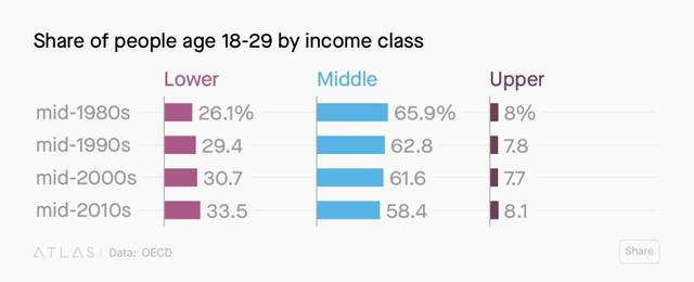 据美媒Quartz,从“婴儿潮一代”到“X一代”(指的是出生于20世纪60年代中期至70年代末期的一代),再到“千禧一代”,中产阶级的比例呈现降低的趋势。