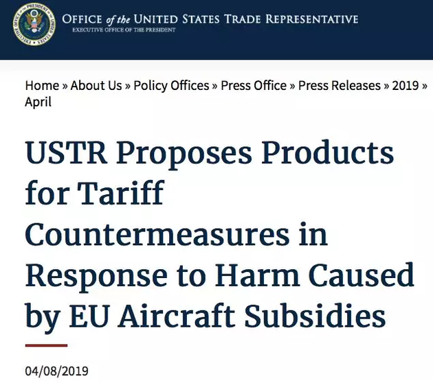 4月8日,美国贸易代表办公室(USTR)公布了一份初步关税报复清单,涉及的欧盟商品总价值110亿美元。美国认为,这刚好等于欧盟对空客的补贴给美国造成的贸易损失。