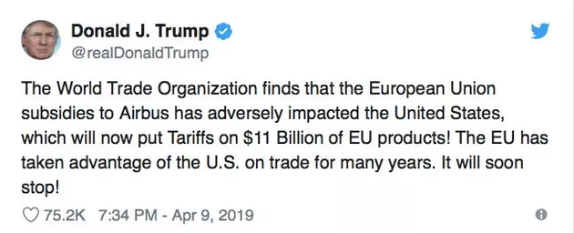 4月9日,美国总统特朗普表示,将会对价值110亿美元的欧盟进口商品加征关税。理由是欧盟对空客的补贴。