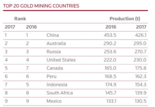 根据2018年GFMS黄金年鉴显示,2017年,全球黄金据报为3246.5吨,这一数字比前一年下降5吨,这是自2008年以来首次出现金矿产量下降。