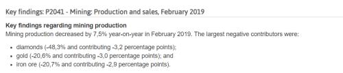 据南非统计局数据,该国2月矿业产出同比下降7.5%,除了黄金产量下降20.6%外,还有钻石产量下降了48.3%,铁矿石产量下降了20.7%。