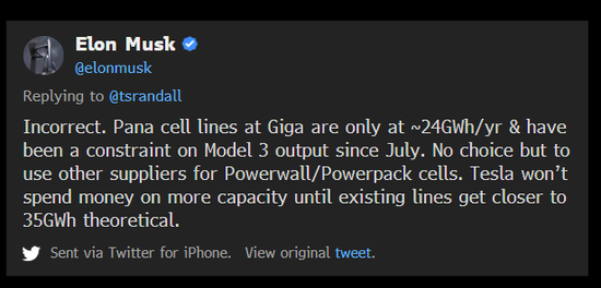 “松下在特斯拉超级工厂的电池生产线产能仅约为24GWh/年,自去年7月以来一直是Model 3产量的限制因素,” 马斯克周六在推特上写道。“在现有生产线接近35GWh之前,特斯拉不会投入资金扩大产能。”