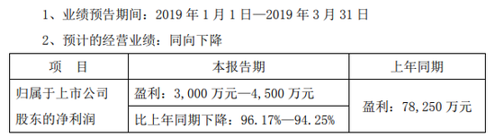 新浪港股讯 晨鸣纸业发布公告,该公司预期2019年一季度归属于上市公司股东的净利润3000万元-4500万元,较上年同期下降96.17%-94.25%。