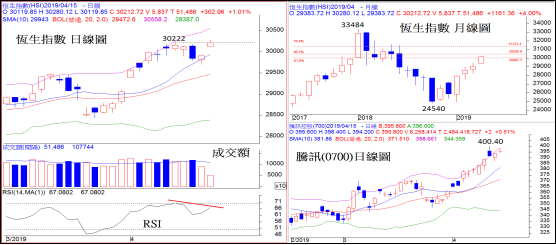 第二,在恆指今早升破4月9日高位的同時,重磅股騰訊(0700)卻未能跟隨升穿4月11日的「木星逆行」日頂部400.40元,因而與大市形成「跨市場頂背馳」的利淡訊號。