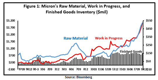 近期,美光库存有英特尔PC短缺和智能手机出货量下滑影响而大幅上涨,如下图所示,其中,原材料和在造芯片库存大幅上升,但是产成品保持持平水平。原材料和在造芯片实际上更受公司管理层的控制,其库存的大幅上涨可能更像是管理层在备货,而在积极备货的情况下,库存反而持平,可能间接说明出货比较顺利。这反映了公司对2019年下半年的良好预期。