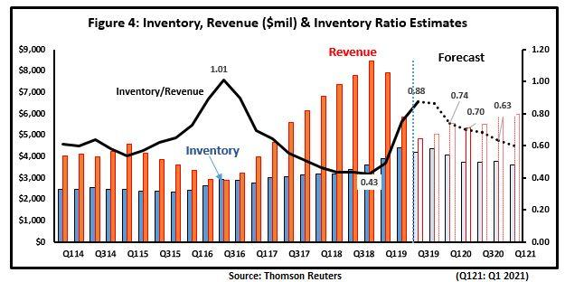 根据路透社的报道,预计2019年Q3库存与收入比率将会见顶,未来将会持续下降,这样将会持续带动股价上涨。不过,当前的股价上涨似乎超前地反映了这一预期,而如果未来不能达到预期水平,股价很可能下跌,所以,在当前的情况下,股价越涨,风险越大。