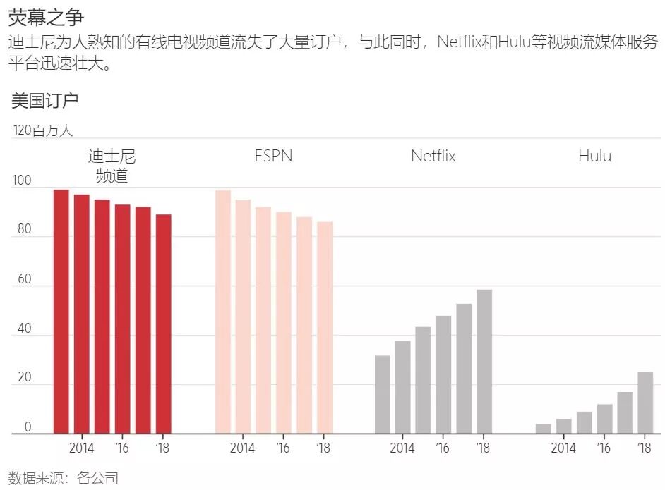 迪士尼已经在运营流媒体服务ESPN+,旨在缓解这个体育频道订户人数的减少。此外,迪士尼还获得了流媒体服务Hulu的多数控制权。