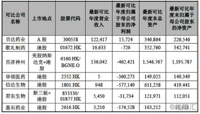 微芯生物可比上市公司财务指标(2018年度,单位:万元摘自微芯生物招股书)