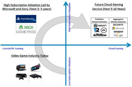 摩根士丹利认为,主机游戏完全向云游戏转换可能将耗时8-15年左右的时间,在云游戏时代下,游戏主机硬件市场将遭受重大冲击,这使得索尼、任天堂扥依赖硬件销售的老牌游戏厂商的未来充满了不确定性;